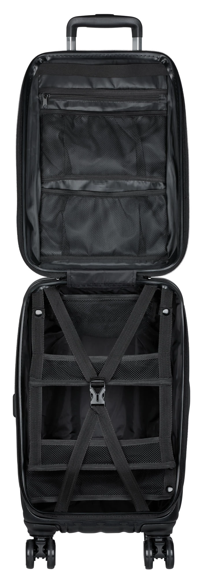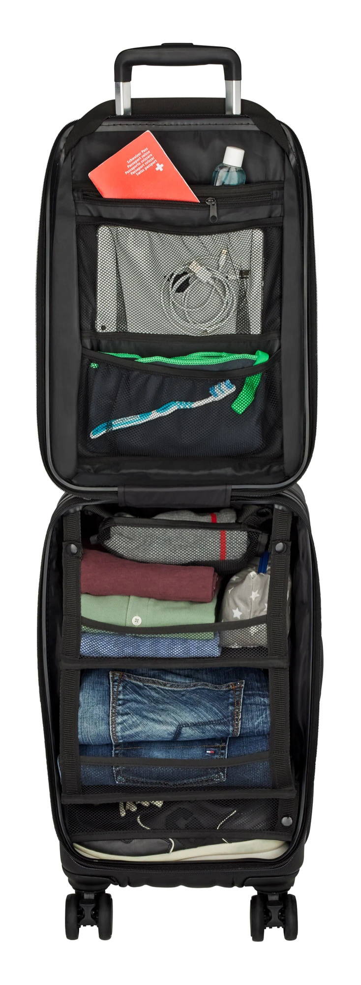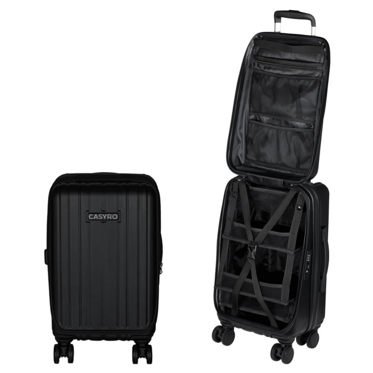Mit dem CASYRO Koffer reisen Sie organisiert und effizient, ohne Zeit mit Aus- und Einpacken zu verlieren. Dank des nach oben aufklappbaren Systems lässt sich der Koffer wie ein Schrank nutzen, sodass Ihre Sachen jederzeit übersichtlich und griffbereit bleiben. Die hochwertige Innenaufteilung ermöglicht ein sicheres Verstauen und einfaches Entnehmen des Inhalts. Die robuste Hartschale sowie das integrierte TSA-Schloss sorgen für Schutz, Sicherheit und Langlebigkeit. Durch die kompakte Grösse eignet sich CASYRO ideal als Handgepäck und ist sowohl für Ferien- als auch für Geschäftsreisen konzipiert. Das moderne, schlichte Design in Schwarz verbindet Funktionalität mit einem professionellen Erscheinungsbild. Entwickelt und patentiert in der Schweiz.