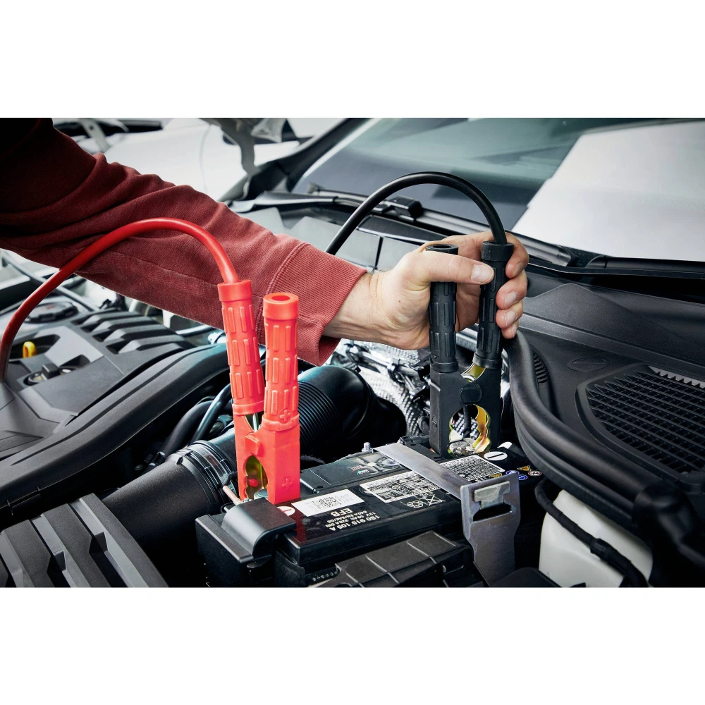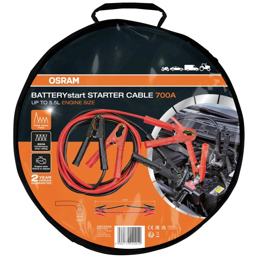 Das OSRAM Starthilfekabel 900A ist ein hochwertiges Starterkabel, welches für den beruflichen und privaten Gebrauch entwickelt wurde. Die Kabel bestehen aus kupferbeschichtetem Aluminium was den Widerstand des Kabels reduziert und eine konstante und effektive Übertragung der Ladung ermöglicht. Das Starthilfekabel hat eine Länge von 4,5 Metern bei einer Querschnittsfläche von 35mm². Dank der Länge und der Querschnittsfläche ist es möglich, Fahrzeuge mit Benzin- und Dieselmotoren mit bis zu 7,0 Litern Hubraum zu starten, da eine Spitzenstromstärke von bis zu 900A erreicht werden kann, gleichzeitig ist eine Dauerstromstärke von 450A gegeben. Es ist für Spannungen von 12V und 24V geeignet. Um einem hohen Verschleiss vorzubeugen ist das OSRAM BATTERYstart STARTER CABLE 900A mit flexiblem und gleichzeitig widerstandsfähigem PVC ummantelt, die isolierten Griffe und die isolierten Klemmen sorgen für zusätzliche Sicherheit und Haltbarkeit. Durch die unterschiedliche Farbgebung der Kabel und der Griffe an den Klemmen verringert sich die Verwechslungsgefahr des Plus- und Minuspoles und somit auch die Gefahr eines falschen Anschlusses an die Batterie. Durch die im Lieferumfang enthaltene Aufbewahrungstasche können die Kabel schonend und platzsparend verstaut werden, praktischerweise ist die Bedienungsanleitung auf der Rückseite der Aufbewahrungstasche mit angebracht und so schnell zu Hand.