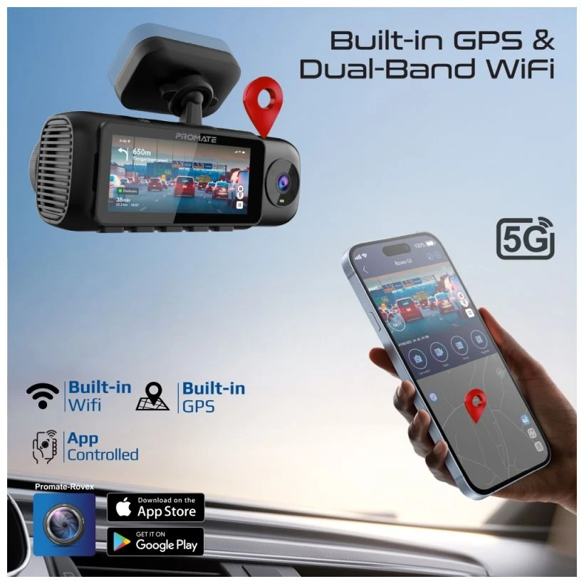 Erleben Sie mit der Promate Rovex-S3 Dashcam eine neue Dimension der Fahrsicherheit. Die 4K-Dreifachansicht zeichnet Front, Innenraum und Heck gleichzeitig in gestochen scharfer Qualität auf. Dank 24-Stunden-Parküberwachung werden Bewegungen und Kollisionen automatisch erfasst und gespeichert. Integriertes GPS und Dual-Band-WLAN dokumentieren Standort, Geschwindigkeit und Route und ermöglichen eine schnelle Datenübertragung.