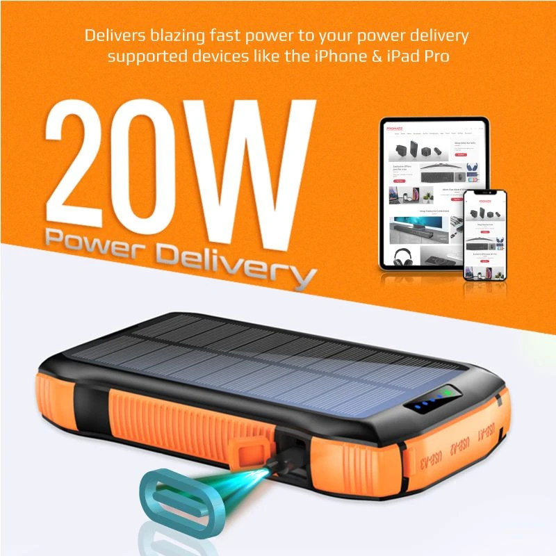 Das eingebaute, langlebige Solarpanel ermöglicht das Aufladen der Powerbank durch Sonnenenergie. Die effiziente Solarzelle bietet eine zuverlässige Möglichkeit, den SolarTank‑20PDQi auch dort nachzuladen, wo keine Stromquelle vorhanden ist – ein entscheidender Vorteil für Outdoor‑Abenteuer.