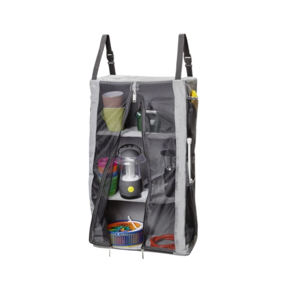 Stay organized in style: Practical hanging storage cabinet with 3 shelves and 4 side pockets for easy access. Durable straps with quick-release buckles ensure secure attachment. Hard-wearing polyester with a zippered mosquito mesh door protects contents while keeping everything in view. Show more