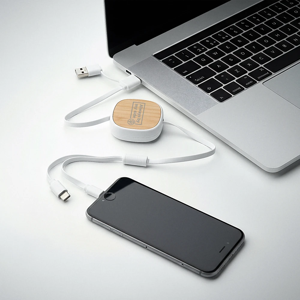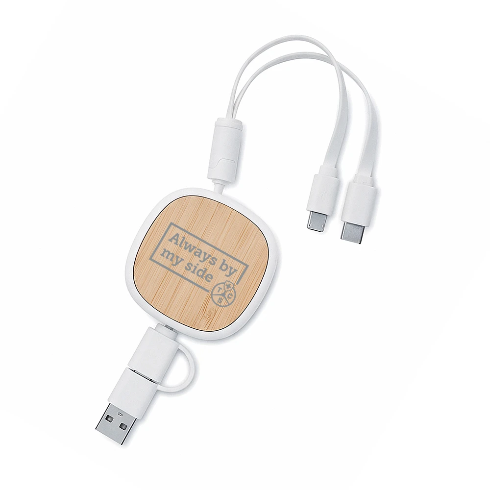 Câble de charge USB rétractable. ABS avec décoration en bambou. Entrée : Type-C et Type-A 2en1. Sortie : Type-C et Micro-B 2en1 et connecteur. Longueur du câble : 90 cm.