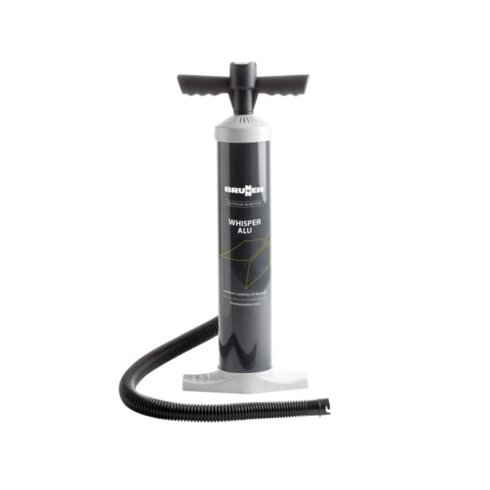 Pompa d'aria compatta Whisper ALU di Brunner con asta del pistone in alluminio robusta per un gonfiaggio efficiente e a risparmio energetico. Include un set di adattatori per un utilizzo versatile. Leggera, maneggevole e ideale per il campeggio e il tempo libero. Mostra di più