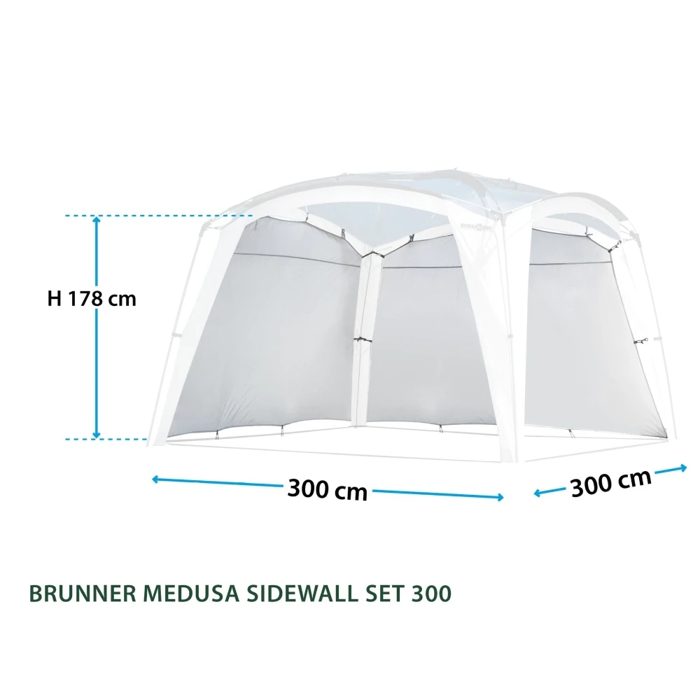 Il set di pareti laterali in due parti per il padiglione Brunner Medusa offre una protezione, privacy e protezione dalle intemperie aggiuntive. Le pareti sono realizzate in poliestere robusto al 100% di colore bianco classico e misurano 300 × 55 × 178 cm (L×P×H), rendendole perfettamente adatte ai padiglioni della serie 300 e facili da montare.